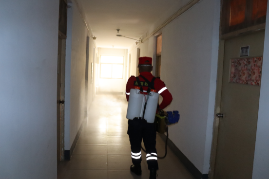 龙湖救援队疫情防控消杀志愿小分队——“疫勇军”一行20人身穿防护服,利用背负动力喷雾机等消杀设备,严格按照标准对校园内部道路、宿舍楼、食堂、商户、下水道、隔离区等区域进行喷雾消毒。整个消杀过程科学专业、认真细微,不留死角,确保消杀工作做到全面、彻底。