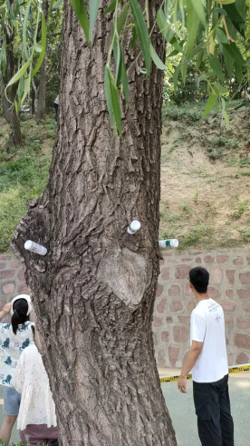 这几天很多同学发现湖边的柳树都扎起了“针”。原来,这是学校为了治理柳絮飘飞,提前为明年做了预防工作。柳树身上这些“针”是一种飞絮抑制剂,今年“扎针”,预计明年可减少80%的飞絮量。连续几年之后,基本消除飞絮产生。