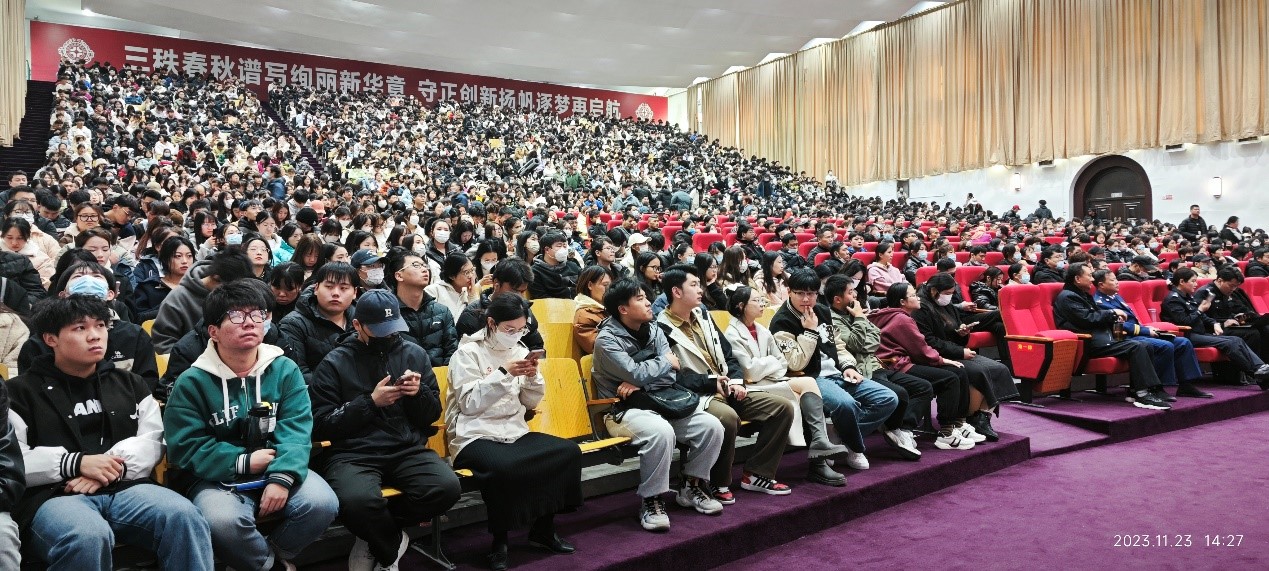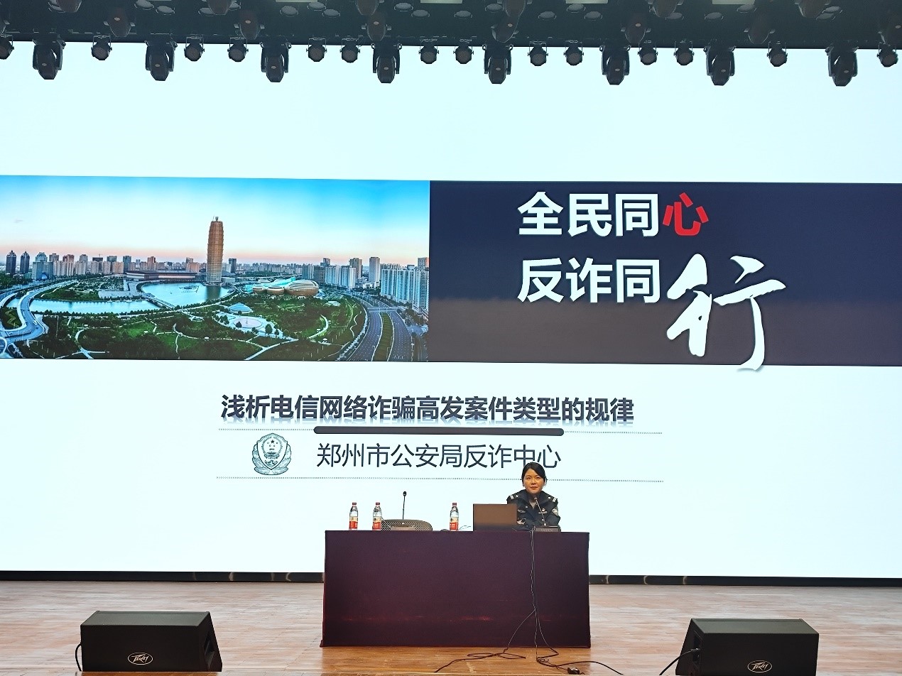 此次活动新郑市公安局龙湖派出所反电信诈骗大学办的姚静警官受邀做专题报告。各部门、学院师生代表两千余人参会,共同学习反电信诈骗相关知识。
