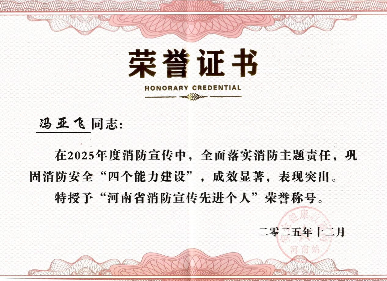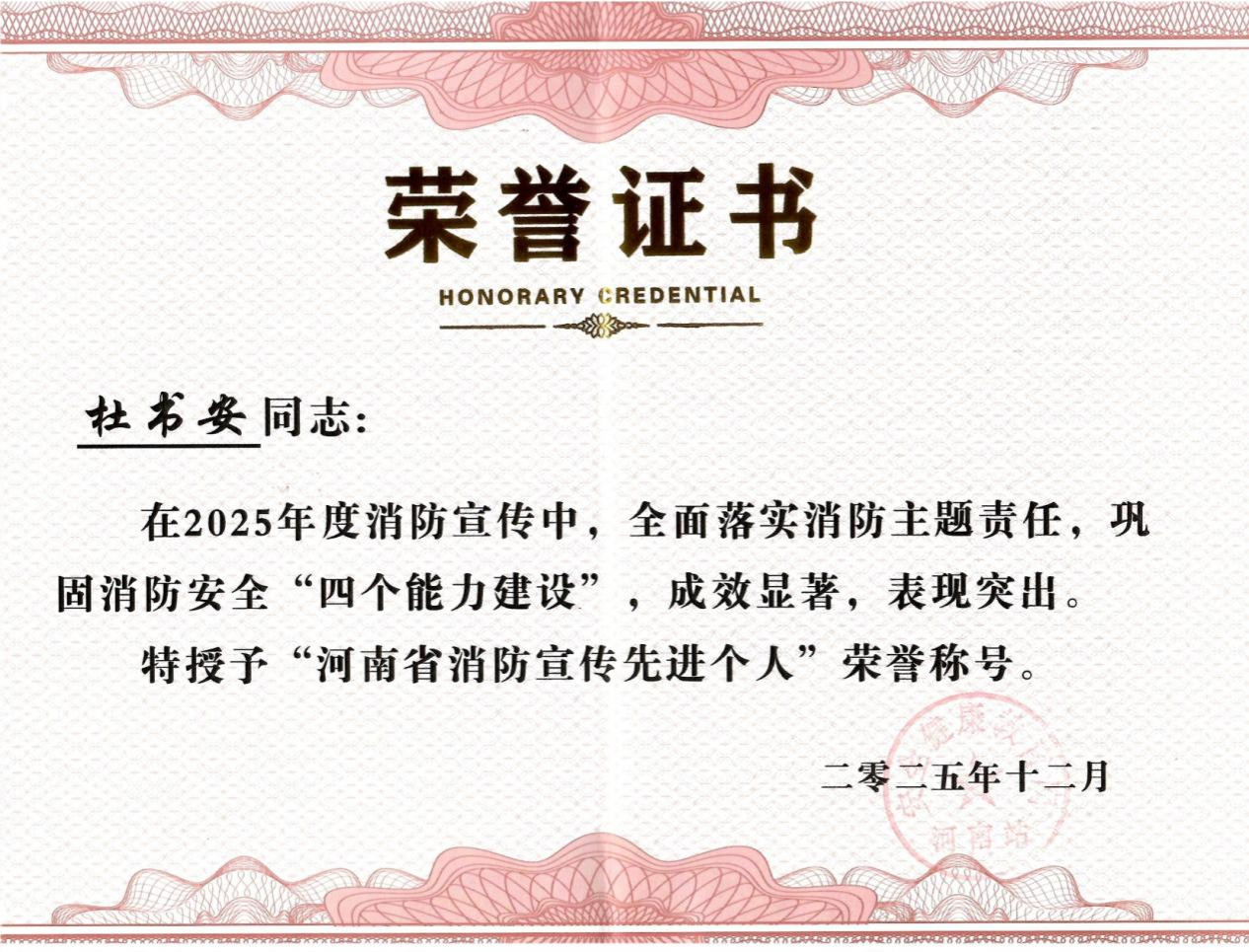近日,喜讯传来,郑州升达经贸管理学院凭借2025 年度消防宣传工作中的扎实举措与突出成效,被安全教育健康网河南站授予“2025 年度消防宣传先进单位”荣誉称号。同时,艺术学院因积极参与消防宣传工作、贡献突出获专项表彰;总务长冯亚飞、总务处保卫科科长杜书安两位同志荣获“河南省消防宣传先进个人”殊荣,实现了集体与个人荣誉的双丰收,彰显了学校消防安全工作的全面成效。